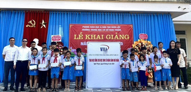 On September 5th, WHA Industrial Zone Nghe An JSC actively participated in the opening ceremony of the new school year by awarding scholarship worth a total of 110 million VND to students in Nghi Loc District. This initiative reflects WHA's ongoing commitment to supporting education and inspiring young minds to overcome challenges and pursue their academic dreams.