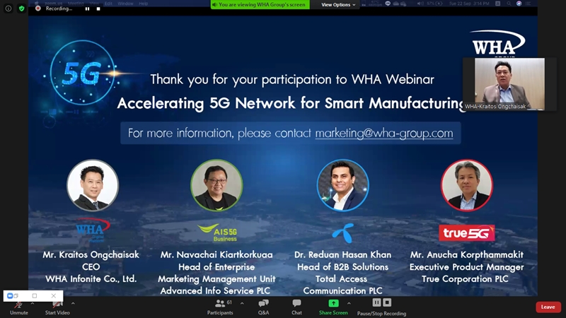 WHA Group recently hosted a webinar for its customers to explain how 5G technology can enhance the services of WHA industrial estates. The webinar discussed the effects of the 5G network on the industrial scene and how the latest technologies will help accelerate smart manufacturing in the Eastern Economic Corridor (EEC) and the country. Participants from different sectors listened to comprehensive presentations and discussions on how machines communicate with each other through the Internet of Things, and how smart manufacturing can improve efficiency, productivity and long-term cost-savings.