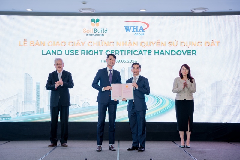 Shown in the photo: Within the framework of the event, Mr. Nha-Vinh Julien, Nguyen (center right), Country Head, WHA Viet Nam presented the Land Use Rights Certificate to Mr. Lim Han Qin (center left), Executive Director of Soilbuild Group Holdings Ltd., witness by Mr. Lim Chap Huat (1st left), Executive Chairman of Soilbuild Group Holdings Ltd. and Ms. Anchalee Prasertchand (1st right), Vice President Vice President - International - Customer Development, WHA Industrial Development Plc., thereby establishing a solid foundation for Long-term cooperative relationships between companion units.
