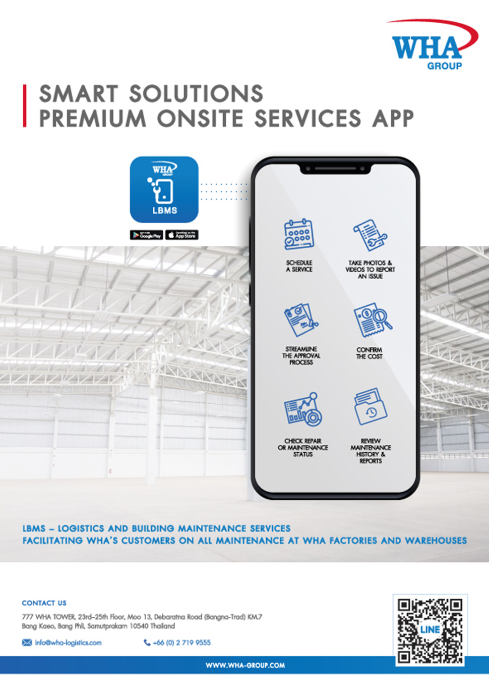 WHA Group has developed and piloted an application for Built-to-suite warehouse and Ready-built warehouse/factory customers to conveniently request for maintenance issues, insurance claims and qualityassurance control. The application was aimed to increase prompt response to customers’ requests, and provide convenience and organization in terms of status tracking. During the application pilot phase from February to August 2020, 132 notifications were reported from 37 customers through the LBMS application. This represented the most numbers of notifications received compared to other available channels. This showcased that the customers are readily opened to using this application system.