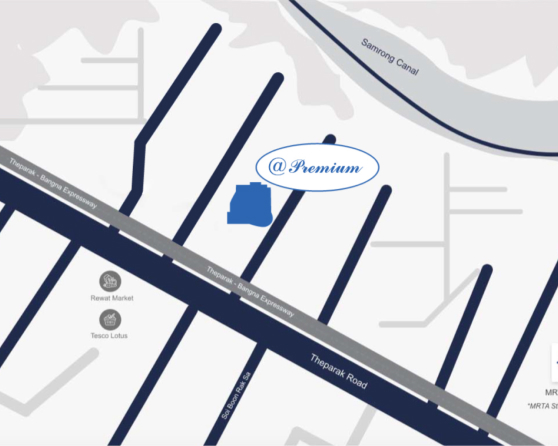 @Premium is well-connected on public transport, moments away from Sri Thepa MRTA* on the Ladprao-Samrong yellow line and only two stops from the Samrong BTS green line interchange.