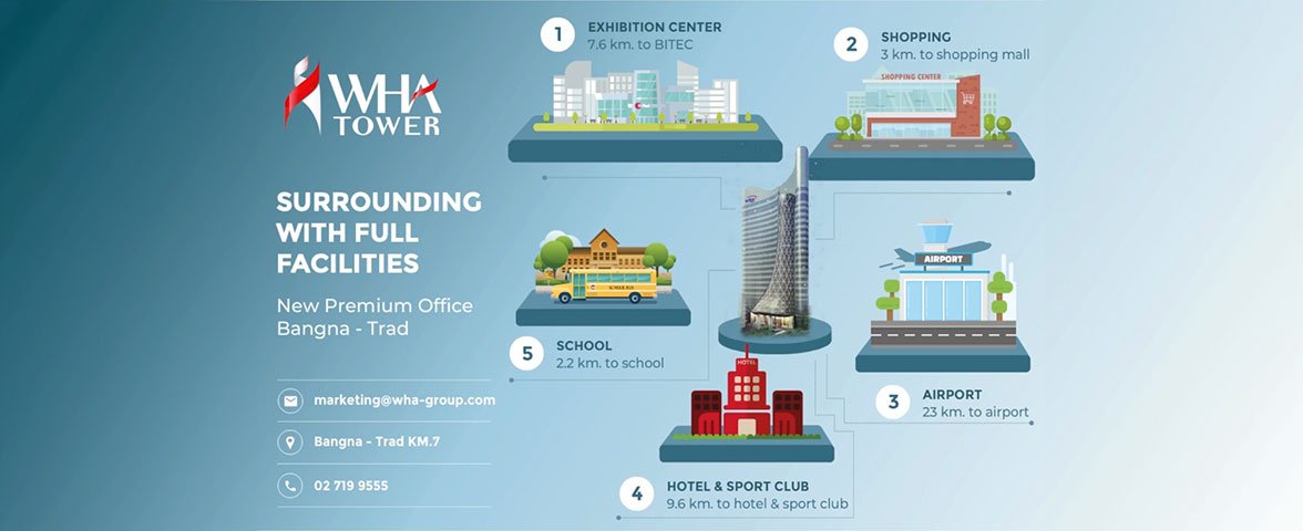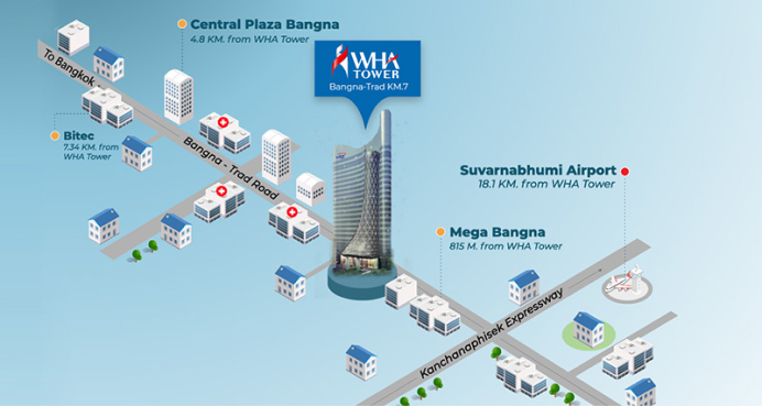 Close to central Bangkok, Suvarnabhumi airport, busy commercial centers, and international schools and universities, WHA Tower is a highly-regarded business address.