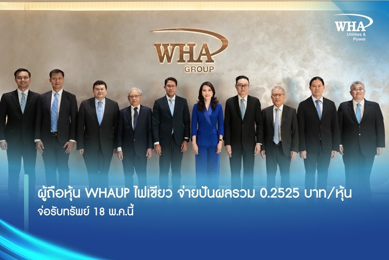 เมื่อเร็วๆ นี้ นางสาวจรีพร จารุกรสกุล ประธานคณะกรรมการบริษัท (กลางขวา) และ นายอัครินทร์ ประเทืองสิทธิ์ ประธานเจ้าหน้าที่บริหาร (กลางซ้าย) พร้อมด้วยคณะกรรมการและผู้บริหาร บริษัท ดับบลิวเอชเอ ยูทิลิตี้ส์ แอนด์ พาวเวอร์ จำกัด (มหาชน) “WHAUP” ร่วมประชุมสามัญผู้ถือหุ้นประจำปี 2569 ผ่านสื่ออิเล็กทรอนิกส์ (E-AGM) ณ อาคาร WHA Tower โดยที่ประชุมผู้ถือหุ้นมีมติอนุมัติทุกวาระตามที่คณะกรรมการเสนอ ซึ่งรวมถึงการอนุมัติจ่ายปันผลเพิ่มเติมสำหรับผลการดำเนินงานปี 2568 ในอัตรา 0.1925 บาทต่อหุ้น ส่งผลให้ยอดรวมการจ่ายเงินปันผลประจำปี 2568 อยู่ที่ 0.2525 บาทต่อหุ้น หรือคิดเป็นจำนวนเงินทั้งสิ้น 965.8 ล้านบาท ทั้งนี้บริษัทฯ เตรียมขึ้นเครื่องหมาย XD ในวันที่ 28 เมษายน 2569 และกำหนดการจ่ายเงินปันผลในวันที่ 18 พฤษภาคม 2569
