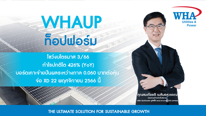 WHAUP ท็อปฟอร์ม โชว์งบไตรมาส 3/66 กำไรปกติโต 426 % (YoY) บอร์ดเคาะจ่ายปันผลระหว่างกาล 0.060 บาทต่อหุ้น จ่อ XD 22 พฤศจิกายน 2566 นี้