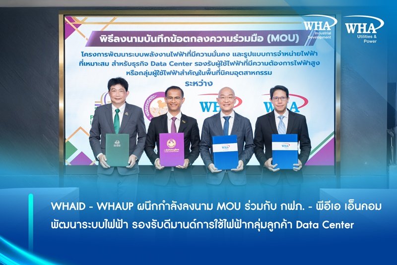 กรุงเทพฯ - บริษัท ดับบลิวเอชเอ อินดัสเตรียล ดีเวลลอปเมนท์ จำกัด (มหาชน) (WHAID) และ บริษัท ดับบลิวเอชเอ ยูทิลิตี้ส์ แอนด์ พาวเวอร์ จำกัด (มหาชน) (WHAUP) ผนึกกำลัง ร่วมลงนามบันทึกข้อตกลงความร่วมมือ (MOU) กับ การไฟฟ้าส่วนภูมิภาค (PEA) และ บริษัท พีอีเอ เอ็นคอม อินเตอร์เนชั่นแนล จำกัด (PEA ENCOM) เพื่อศึกษาโครงการพัฒนาระบบพลังงานไฟฟ้าที่มีความมั่นคง และรูปแบบการจำหน่ายไฟฟ้าที่เหมาะสม สำหรับธุรกิจ Data Center เพื่อรองรับผู้ใช้ไฟฟ้าที่มีความต้องการไฟฟ้าสูง โดยเฉพาะกลุ่มผู้ใช้ไฟฟ้าสำคัญในพื้นที่นิคมอุตสาหกรรมของ WHAID
